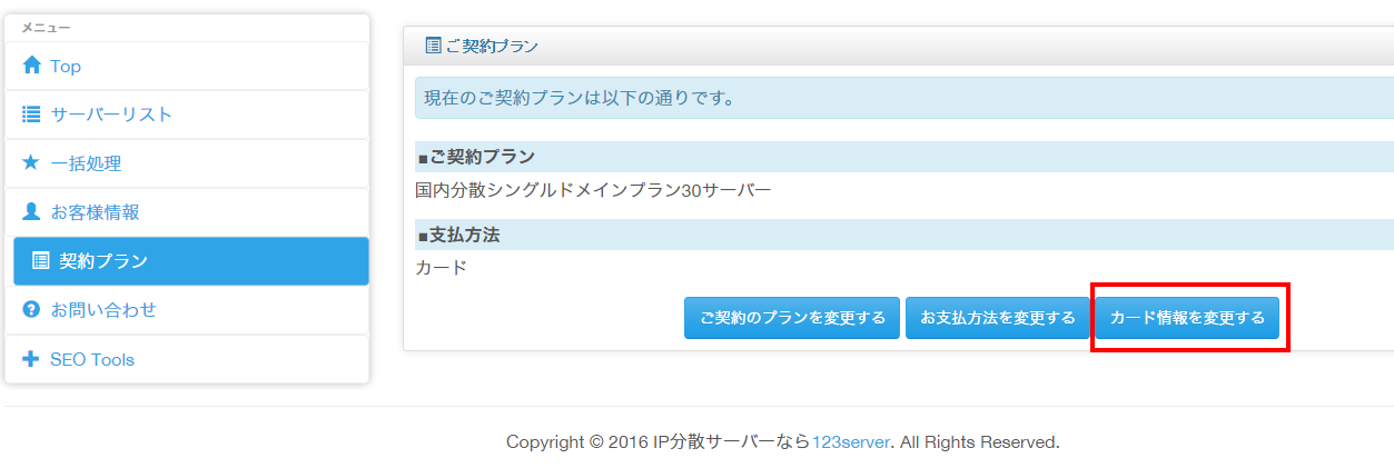 「カード情報の変更」画面でページ内の「自動課金番号をチェックし、「カード情報を変更する」ボタンをクリックしてください。